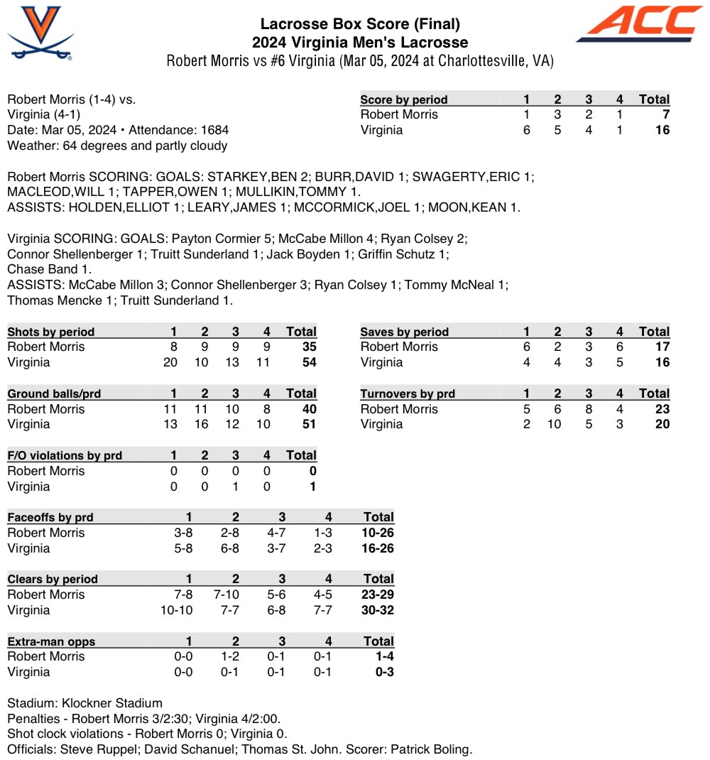 - Virginia improved to 5-0 in the all-time series with Robert Morris.