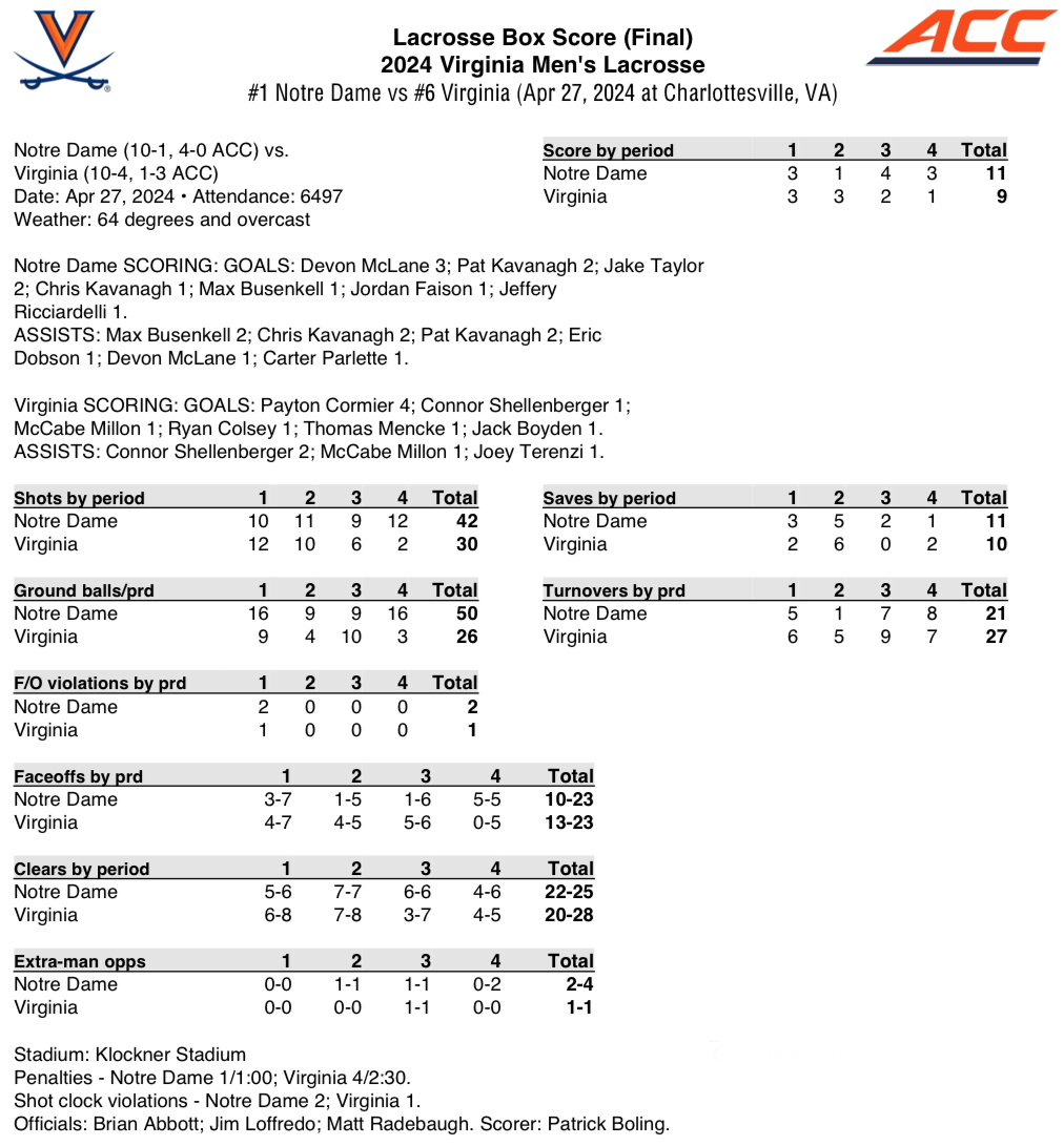 The Fighting Irish (10-1, 4-0 ACC) dominated the ground ball battle, 50–26, and UVA uncharacteristically committed 27 turnovers, eight of which were on the clear.