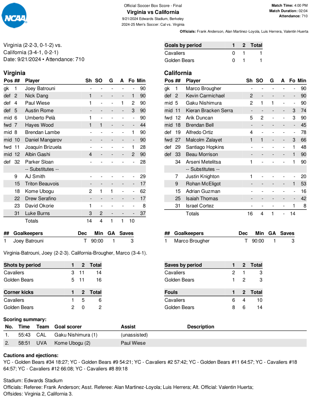 With 55 minutes played in the game, it was California (3-4-1, 0-2-1) that opened the scoring, as Gaku Nishimura hit a deflected shot off the half-volley and rocketed his chance into the roof of the net to give the Golden Bears the lead at 1-0.