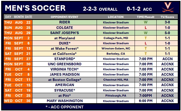 • Kome Ubogu scored his second goal of the season and first since Virginia’s season-opening win over Rider (8/22/24)