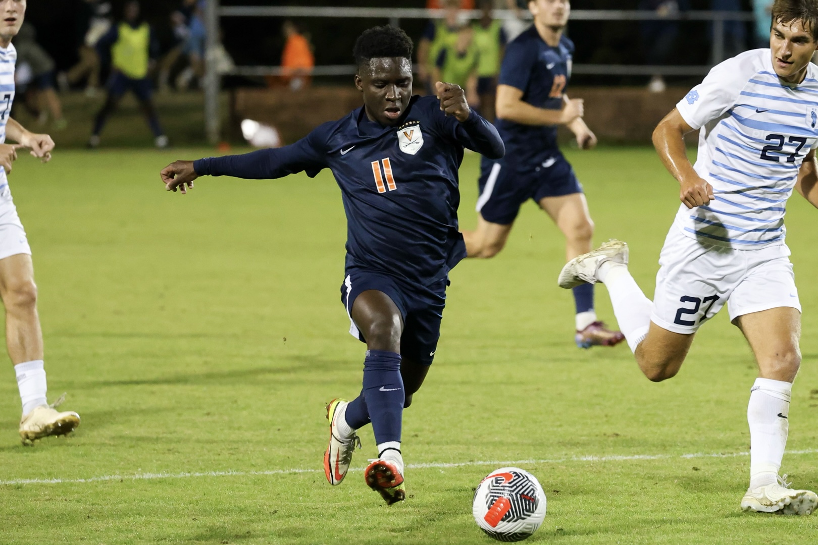 In the 85th minute, Virginia’s holding midfielder, Umberto Pelà applied pressure high up the field gaining possession before smashing the ball off a Tar Heel defender to win a Virginia corner kick. An out-swinging ball from Axel Ahlander was headed back into the center of the penalty area where Thiam fired a strike into the back of the net to give Virginia its one-goal lead.