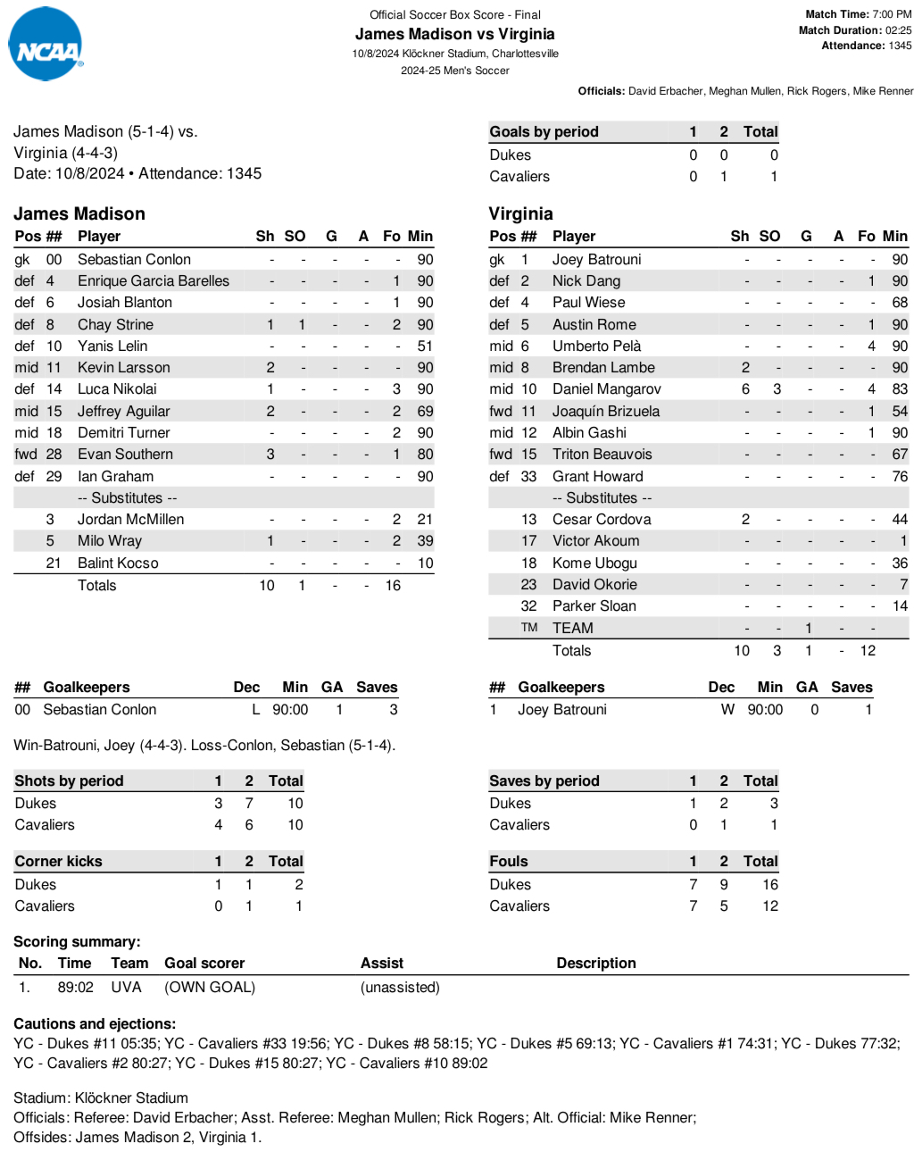 - The two teams combined for nine yellow cards (UVA 4, JMU 5)