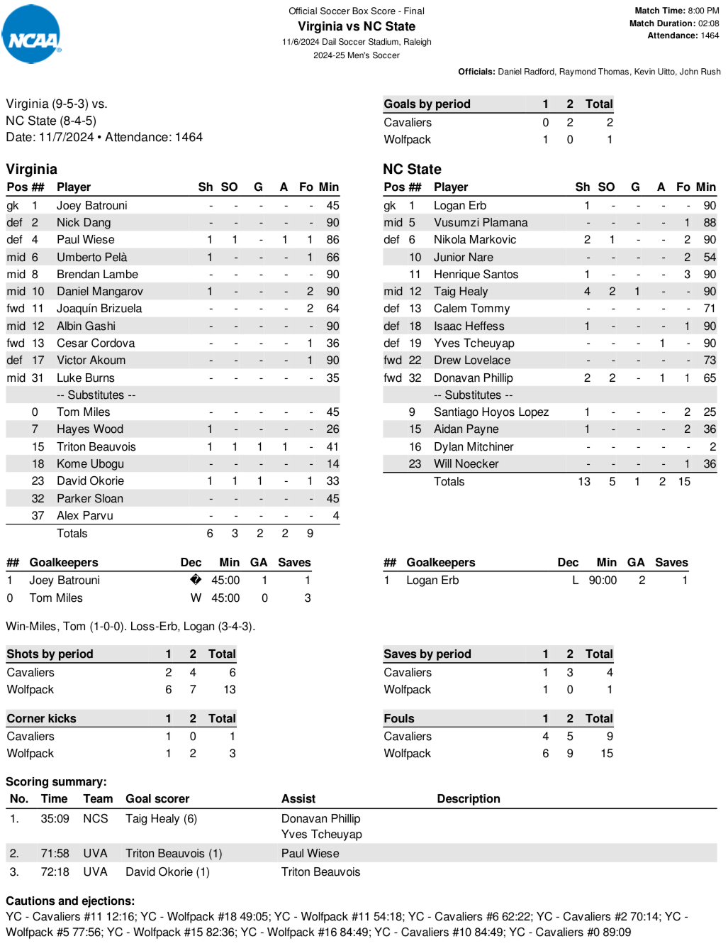 NC State would break through in the 36th minute, as Phillip Donovan flicked a pass from the top of the penalty area on to Taig Healy who finished low at the far post, giving the Wolfpack a 1-0 advantage that it would take to the halftime break.