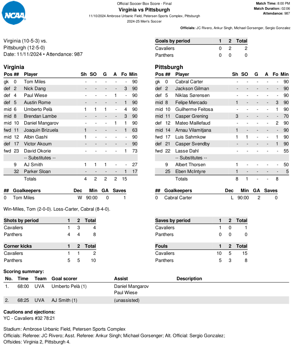 The Cavaliers continue to perform their best in the second halves of matches. Virginia was able to withstand a few Panthers attacks, including one great save by Tom Miles on a Pitt corner. Moments later in the 67th minute, the Cavaliers earned a corner of their own. Paul Wiese decided to play the ball quick and short to Daniel Mangarov. Mangarov then whipped a driven ball to the back post, where Umberto Pelà timed his run to perfection and headed home his first goal of the season. It was another great set-piece goal, this time catching the defense off guard.