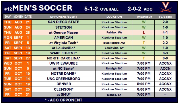 The Cavaliers will be back in action on Wednesday (Oct. 1) when they host Milwaukee at Klöckner Stadium. Kickoff is set for 7 p.m. on ACC Network Extra.