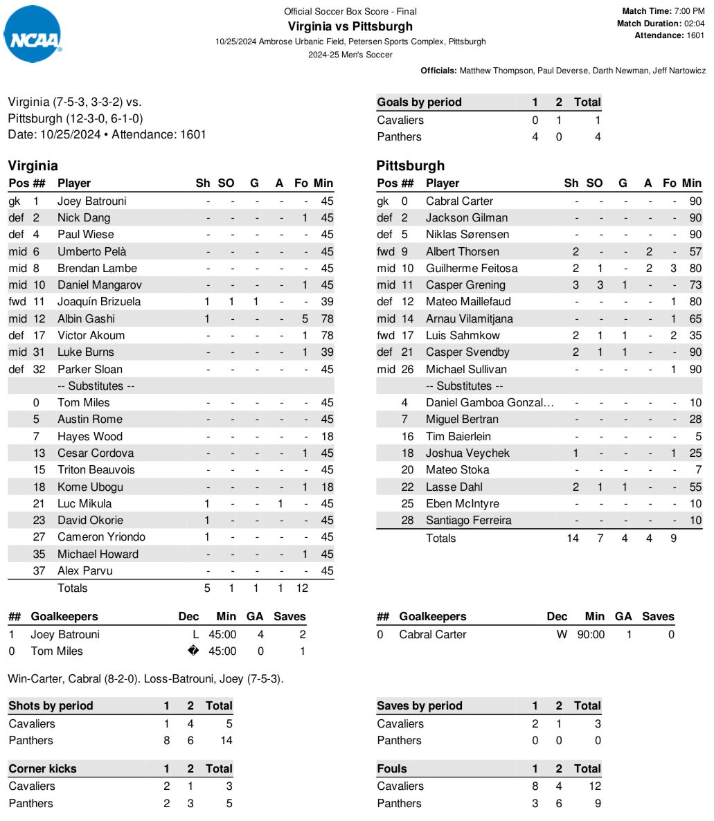 The Virginia men’s soccer team suffered a 4-1 defeat at No. 5 Pitt on Friday at Ambrose Urbanic Field in Pittsburgh.
