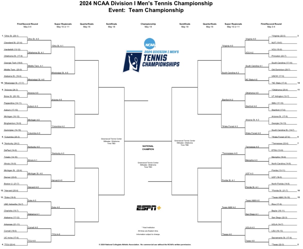 Here are the sixteen remaining teams in the 2024 NCAA Division I Men’s Championship!#WeAreCollegeTennis | #NCAATennis pic.twitter.com/7GWe9awZlu