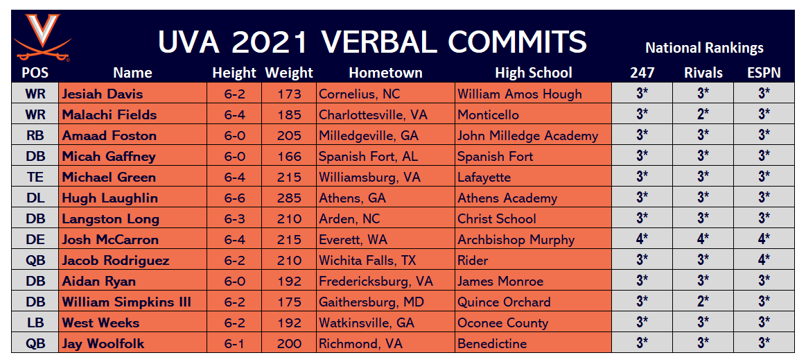 Ryan, a 6-foot-1, 190-pound, 3-star safety, became UVA’s 13th commitment to the recruiting class of 2021 (see list below), and the fourth from the state of Virginia, along with a fifth player from the state who is in prep school in North Carolina.
