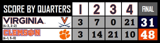 Virginia hung around for a half against 10th-ranked Clemson Saturday, but the Tigers dominated the third quarter en route to a 48-31 win in Death Valley.