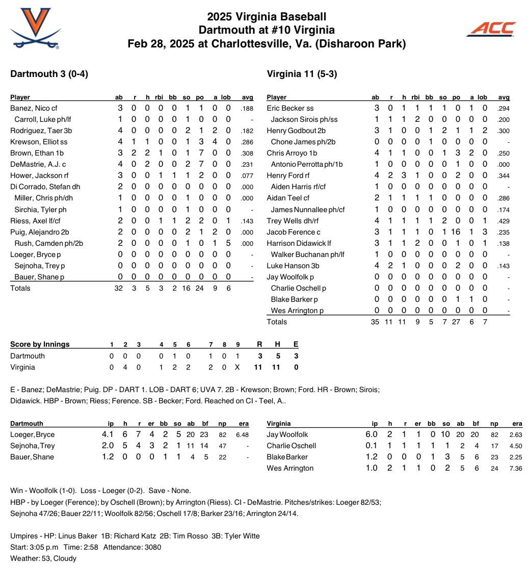No. 10 Virginia claims series opener against Dartmouth, 11-3