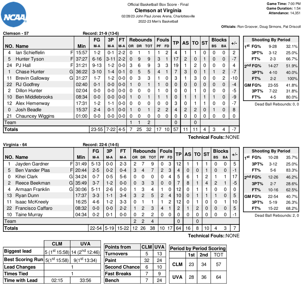 Clemson was led by PJ Hall’s 19 points and 9 rebounds, while Hunter Tyson added 17 points and 9 boards in the losing effort, as the Tigers shot at a higher clip overall (42 percent from the field, 32 percent from deep, 80 percent from the line), but as Brownell put it, “I think both teams played exceptionally hard; [the Cavaliers] played a little better than we did.”
