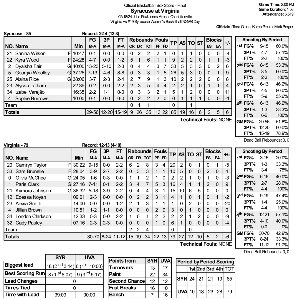 The Cavaliers (12-13, 4-10 ACC) were led by Camryn Taylor (20 points, 9 for 15 FG, 8 rebounds), Paris Clark (16 points, 7 for 11 FG, 7 rebounds) and Kymora Johnson (15 points, 10 assists), who recorded her first career double-double. Johnson’s 10 assists are also a season high. Sam Brunelle added 10 points and 5 assists.
