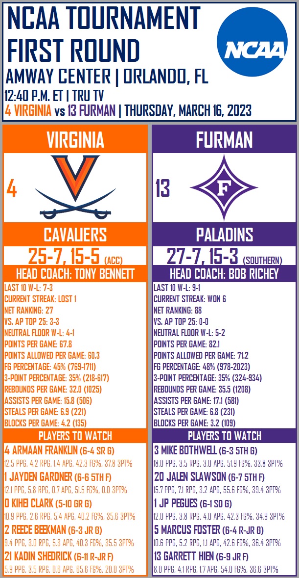 No. 4 seed Virginia will face No. 13 Furman on Thursday in Orlando NCAA’s