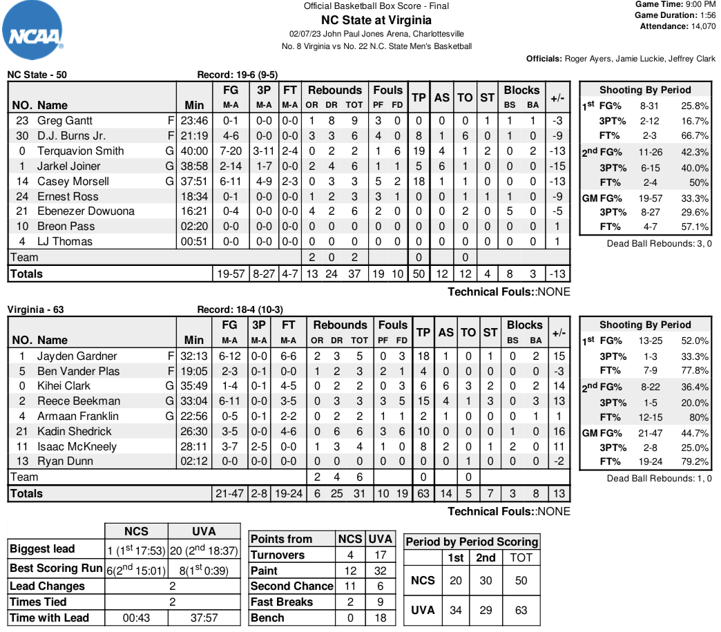 The Cavaliers took their largest lead of the night, 40-20, on an easy Vander Plas basket underneath, on a sweet assist from Gardner. State shot an abysmal 26 percent across the opening 20 minutes (17 percent from 3-point land), but clawed back within single digits as the clock approached the seven-minute mark on a Burns bucket, 51-42.