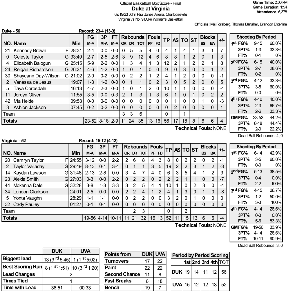 Duke scored the first five points of the game, but a 3-pointer from Dale ignited the Virginia offense. A 3-pointer from Kaydan Lawson gave UVA a 10-9 lead with 5:02 left in the opening quarter, but Duke scored four straight baskets to take a seven-point lead. A jumper from Camryn Taylor and a 3 from Yonta Vaughn got the Cavaliers back to within two, 17-15, but Taya Corosdale hit a jumper in the paint in the final seconds of the period to give Duke a 19-15 advantage.
