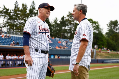 Odom, still game at 50, went all the way back to the pitcher’s mound to throw the ceremonial pitch to his special catcher, UVA Hall of Fame baseball coach Brian O’Connor.