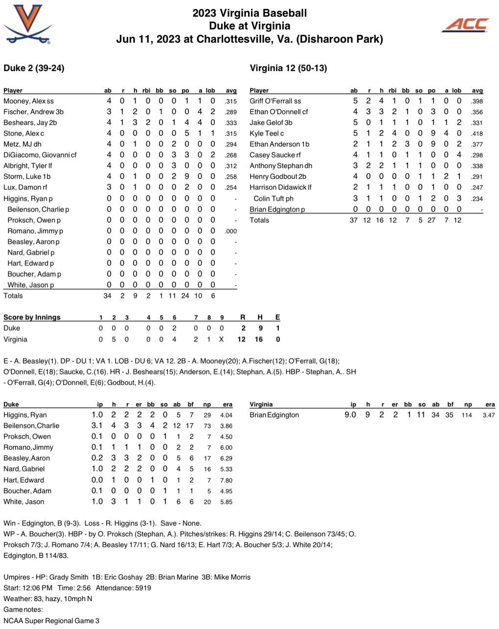 - Virginia’s five-run second inning marked the 24th time this season UVA has scored five or more runs in a single inning. It was also the most by either team in the Super Regional series between Duke and the Cavaliers.