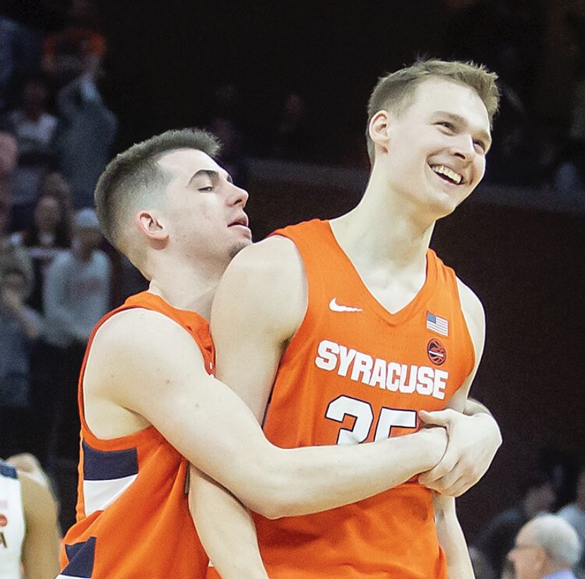 Syracuse’s Buddy Boeheim (35) gets a hug from teammate Joe Girard III after banking in a three-pointer in overtime (Photo by John Markon).