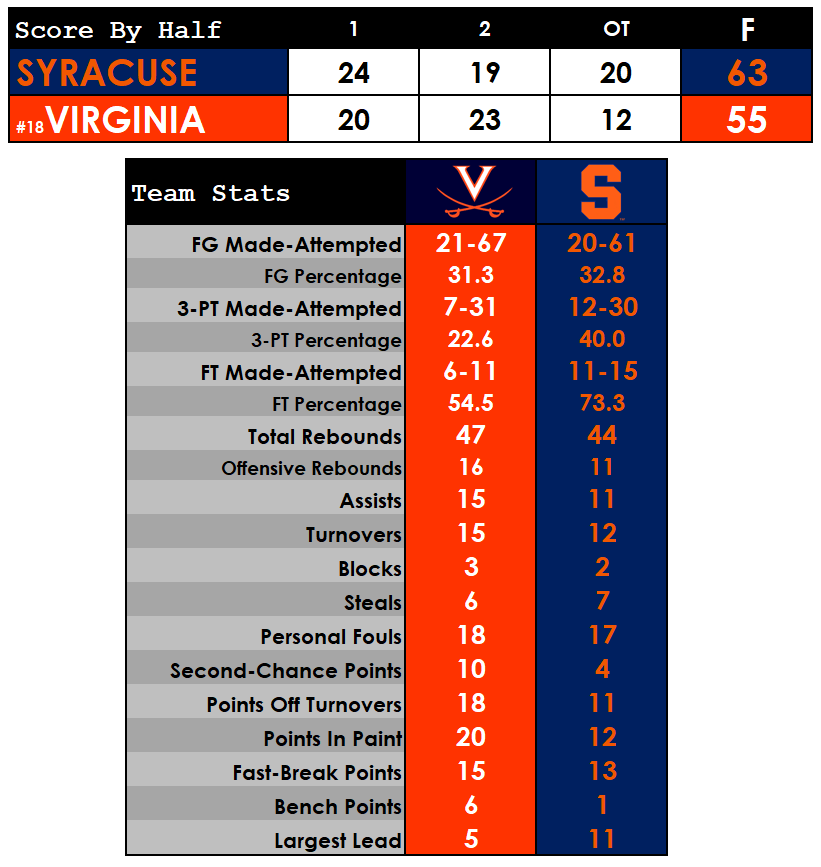 - UVA went on a 12-0 run to gain a 35-30 lead at 12:03 second half (Syracuse scoring drought 6:49)