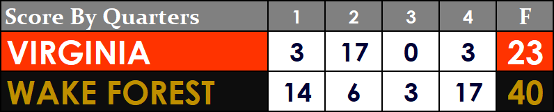 Virginia posted 420 total yards — 218 rushing, 202 passing — but gave up 483 to the Deacons, including 309 through the air. The Wahoo defense had held the Deacs to just 77 rushing yards on the day prior to the 75-yard Walker touchdown in the fourth quarter, as he nearly doubled the team’s ground output in one play. Wake finished with 174 rushing yards; Walker had 128 of them.