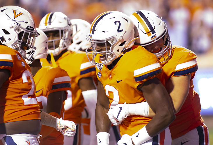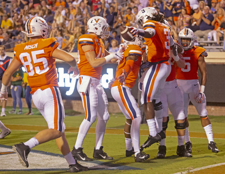 Teammates help Virginia’s Bryce Perkins celebrate in the end zone after a touchdown run.
