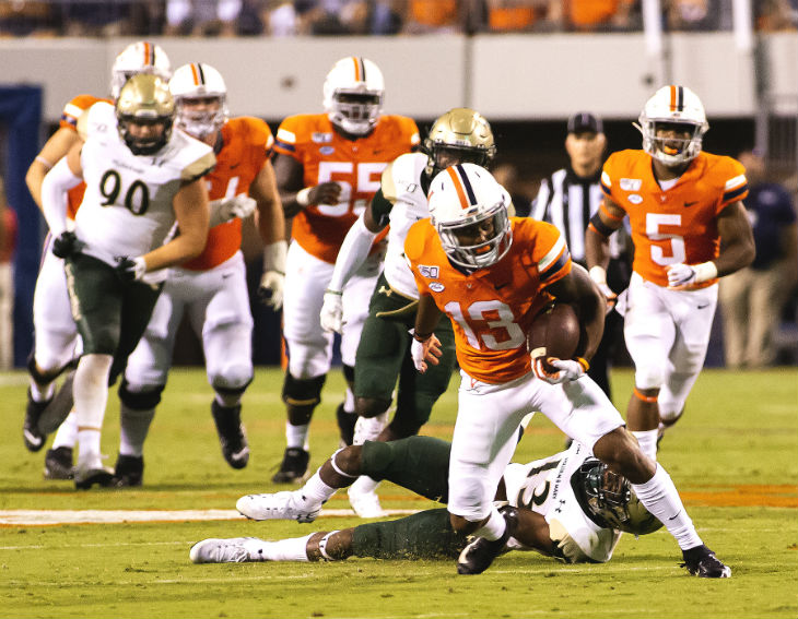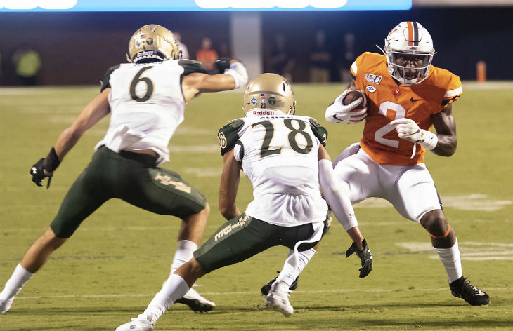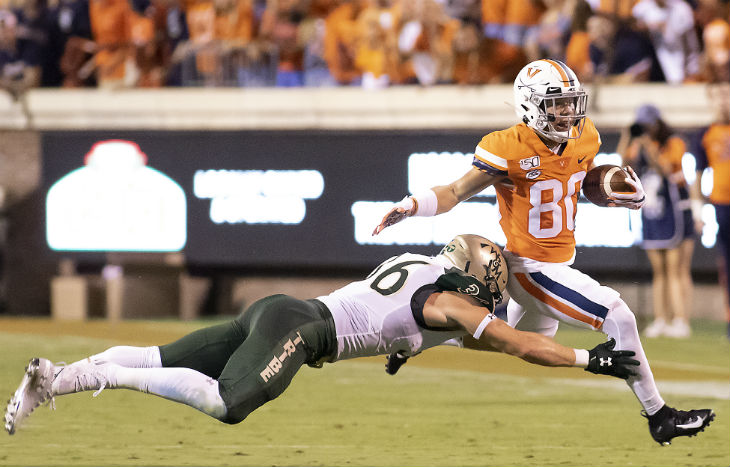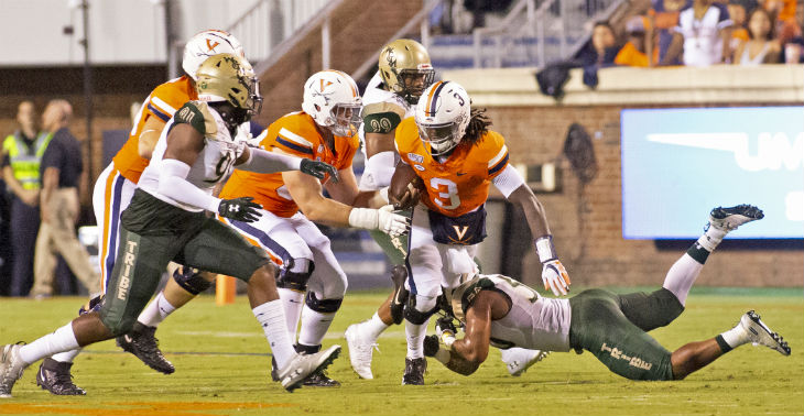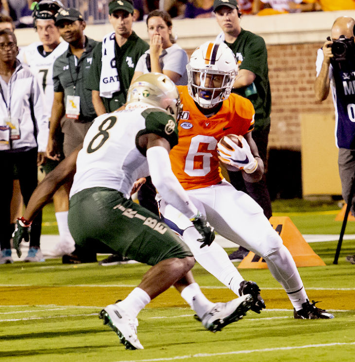 Terrell Jana of Virginia steps out of a tackle by W&M’s Nate Lewis.