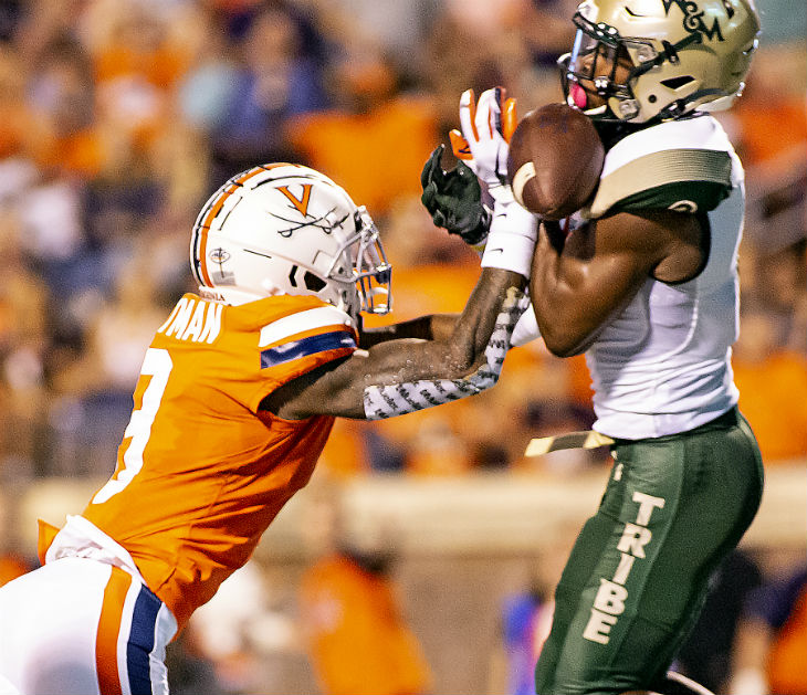 Virginia receiver Terrell Chatman prevents an interception by Tribe cornerback Corey Parker.