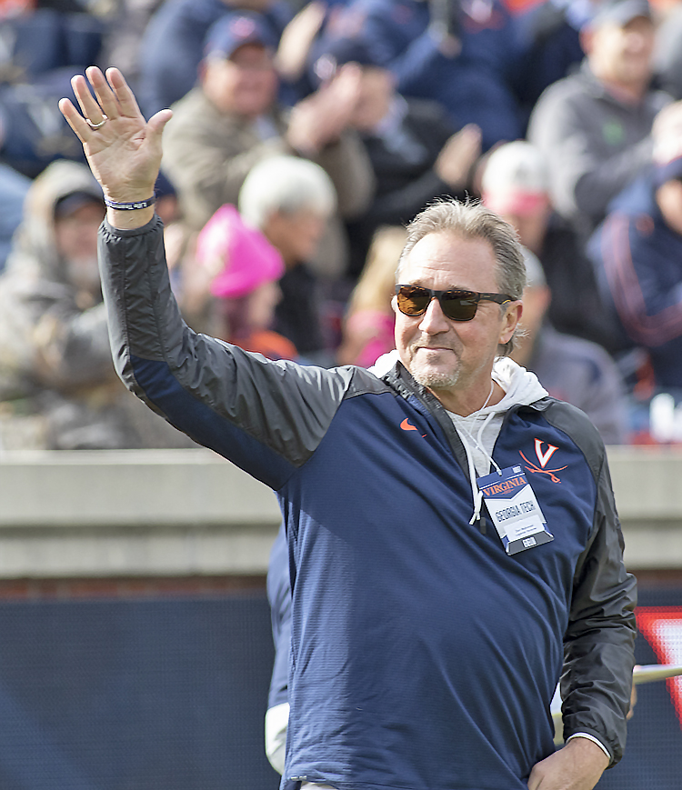 Former U.Va. quarterback Don Majkowski waves tio the homecoming crowd at Scott Stadium.