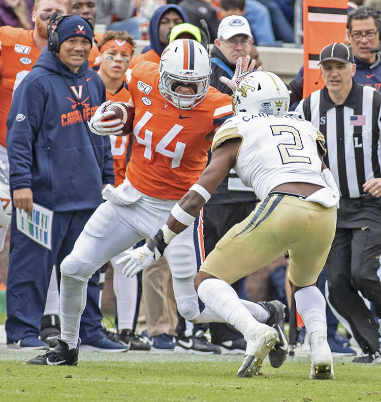 Wayne Taulapapa of U.Va. steps out of a tackle and heads upfield.