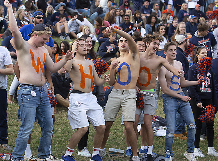U.Va. lineman Bobby Haskins (70) gives Bryce Perkins a lift after Perkins’ third rushing TD.
