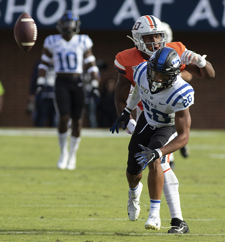 A long pass escapes both Virginia’s Joe Reed and Duke’s Michael Carter (26).