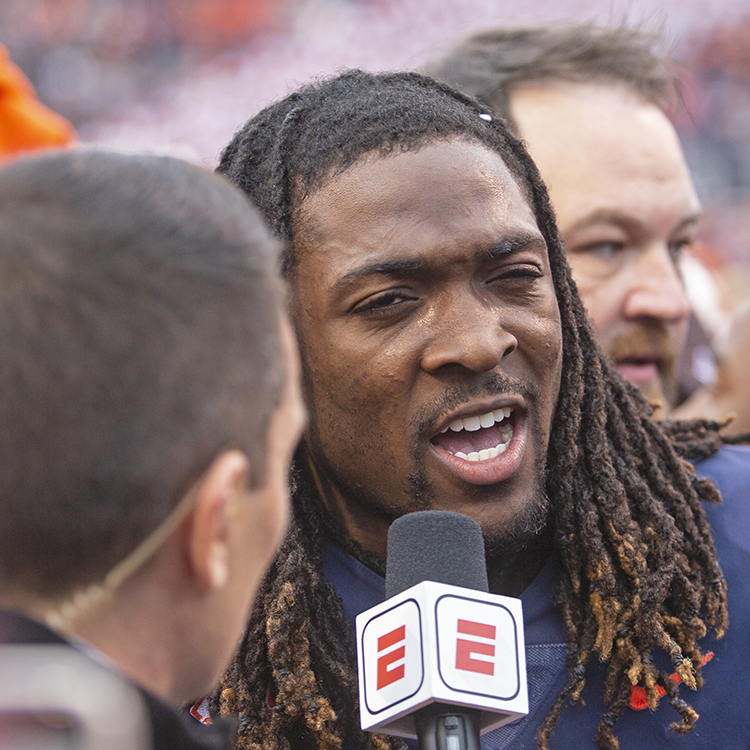 Virginia QB Bryce Perkins is interviewed on the field following the Cavaliers’ 39-30 win over Virginia Tech.