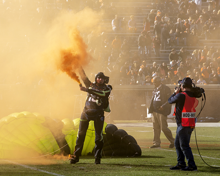 Parachutists trailing orange smoke landed on the field prior to Friday’s game.