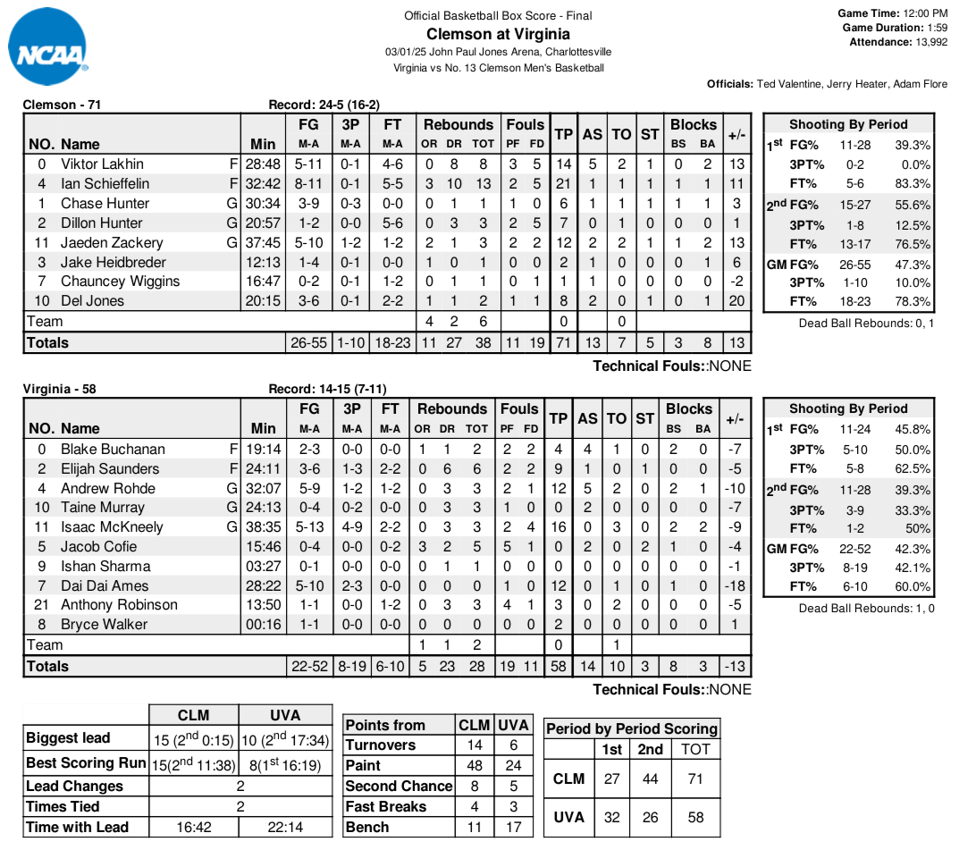 Still, after the Tigers’ 20-2 run, UVA wasn’t finished. Back-to-back 3’s by Andrew Rohde and Saunders got the Cavaliers within a bucket, 47-45, with 10:38 to play. But Clemson turned up its intensity on defense and slowly pulled away. Virginia went nearly seven minutes without scoring down the homestretch.