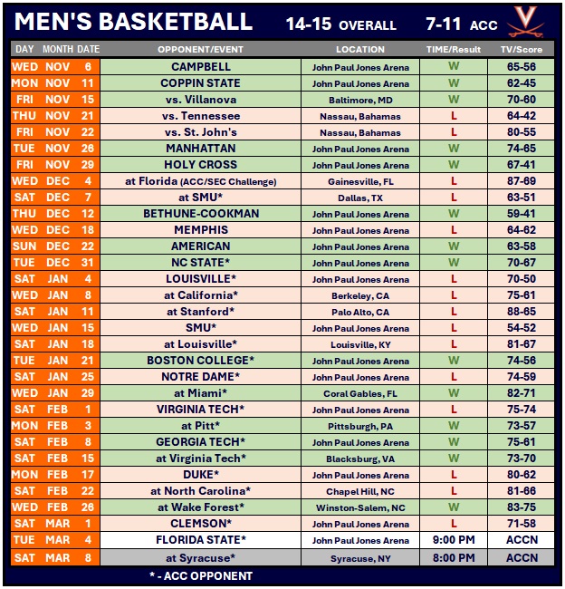 - UVA celebrated Senior Day, honoring managers Christian Shiels and Isaiah Stanfield, Bryce Walker (2 points) and Taine Murray pregame