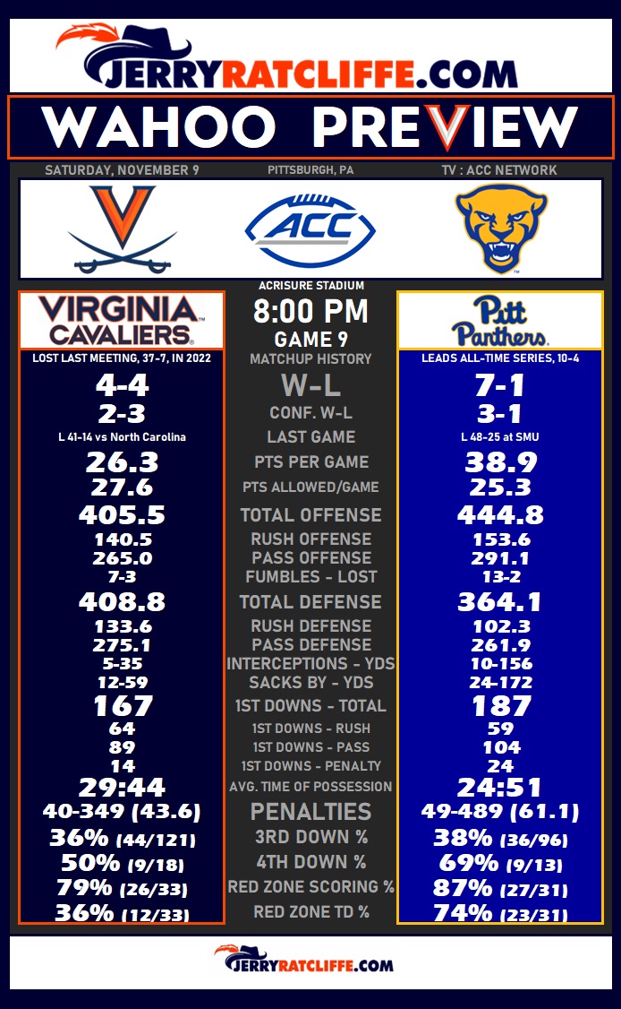 The fact that the Cavaliers have those injured linemen back and healthy after a bye week certainly should help, but look for Pitt to test Virginia early to see if Elliott and his staff have fixed the problem.