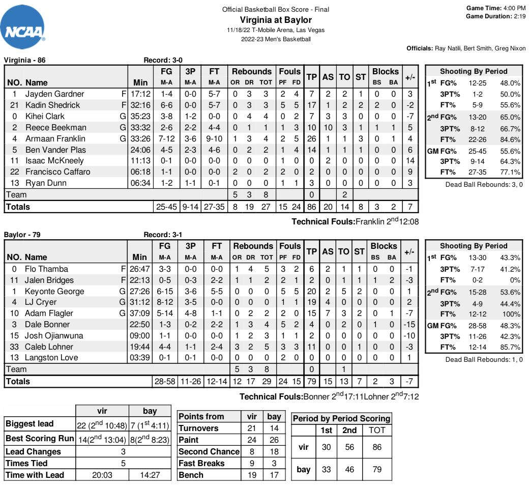 Franklin didn’t do it alone. His shooting was contagious. Kadin Shedrick posted 17 points (6-of-6 shooting) and recorded two blocked shots. Ohio transfer Vander Plas scored 14 points (4 of 5 from the field) and Beekman put up his second career double-double with 10 points and 10 assists. Kihei Clark and Jayden Gardner each scored seven points for the Cavaliers, who put up an eye-popping 56 points in the second half against a Baylor team that had won 41 of its last 44 games against nonconference opponents.