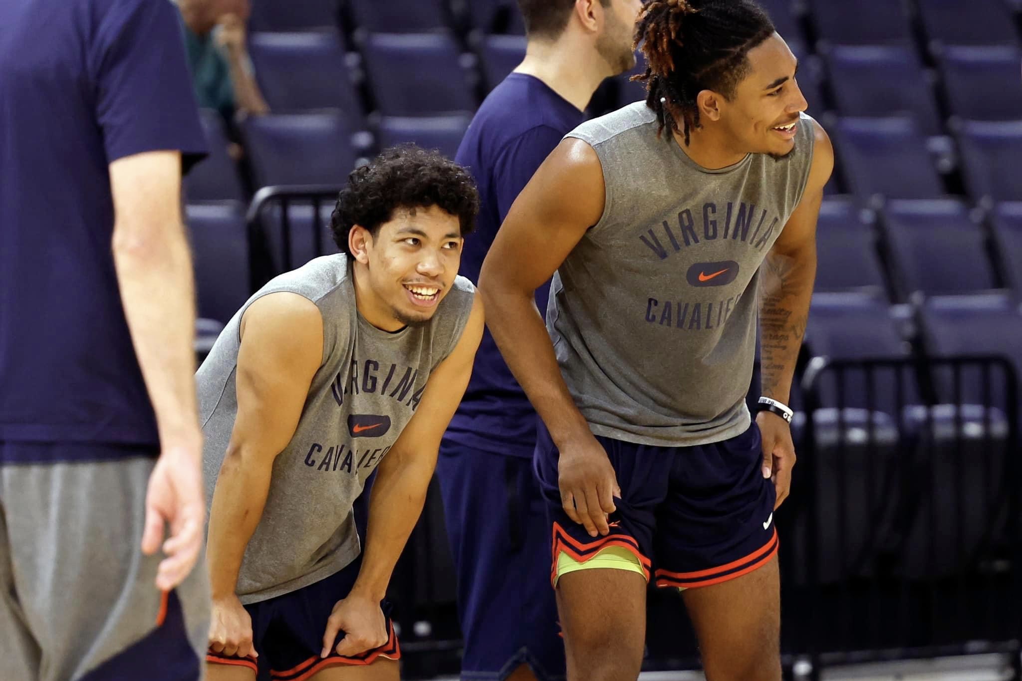 Virginia guads Kihei Clark and Armaan Franklin share a laugh at a recent practice. (Photo: UVA Athletics)
