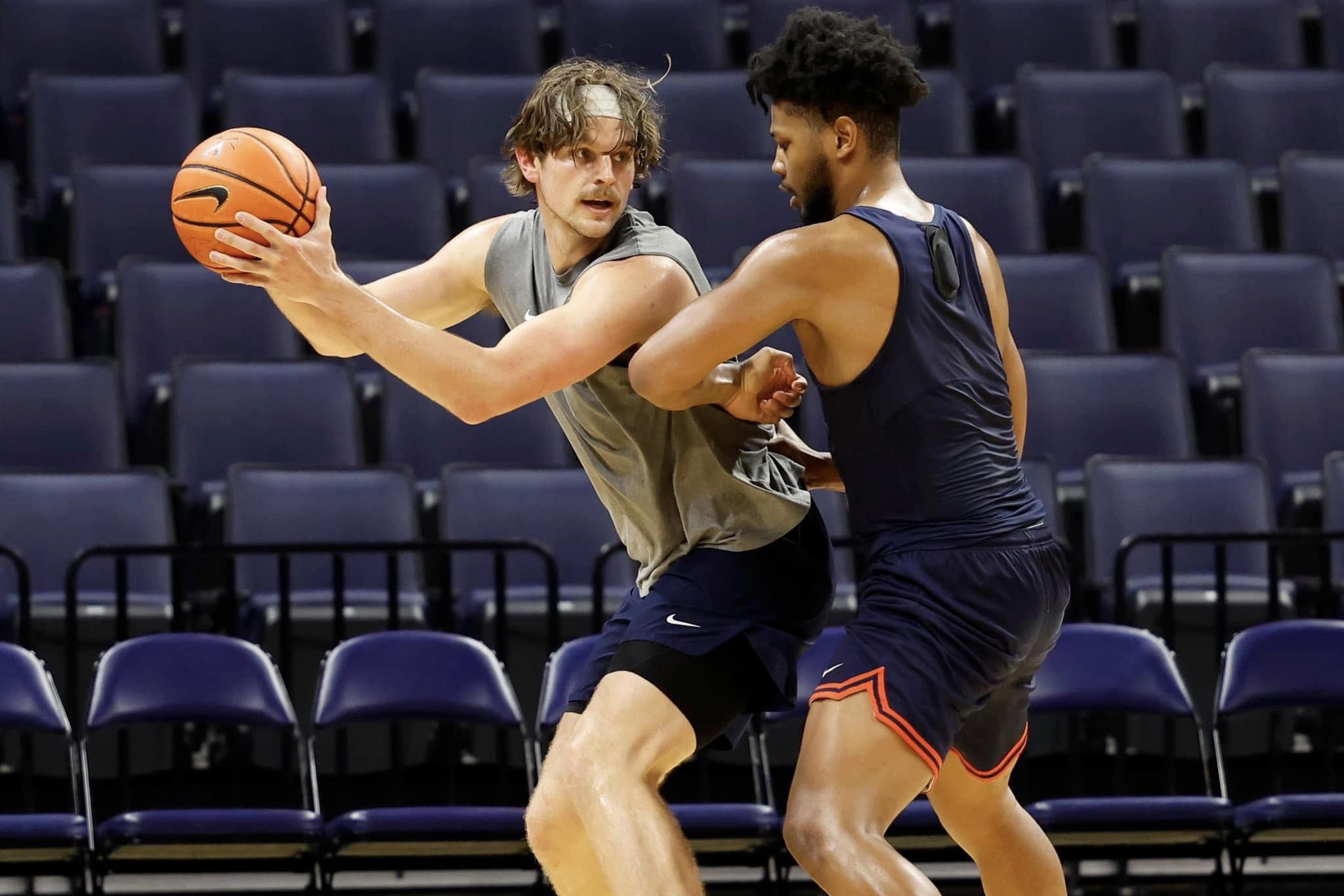 Ben Vander Plas (left) goes up against new teammate Jayden Gardner in practice. (Photo: UVA Athletics)