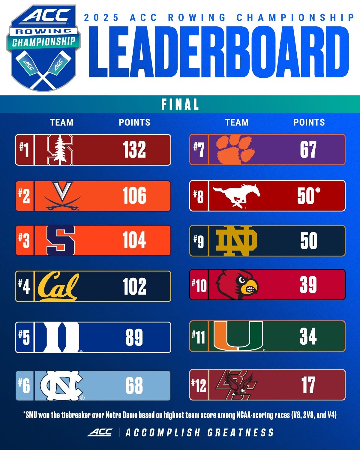 1. Virginia, 7:13.476, 2. Notre Dame, 7:20.436, 3. SMU, 7:20.656, 4. Boston College, 7:21.059, 5. Miami, 7:30.646, 6. Louisville, 7:31.526