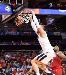 Virginia center Jack Salt dunks Thursday against NC State. (Photo by Sara D. Davis, the ACC)