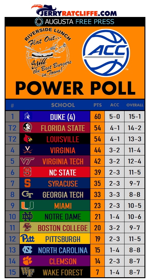 Sponsored by Lee Shifflett’s “Riverside Lunch,” downtown, where you’ll find the best burgers in Charlottesville, we are into our second week of our ACC Power Poll (see accompanying graphic).