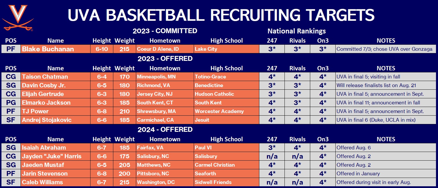 - 2023 sharpshooter Davin Cosby Jr., who holds an offer from UVA, will visit Charlottesville on Aug. 26.