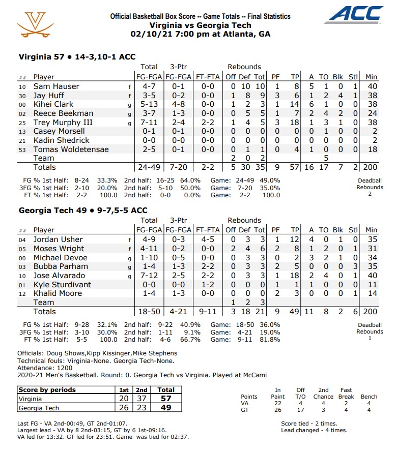 • UVA defeated Georgia Tech 64-62 earlier this season