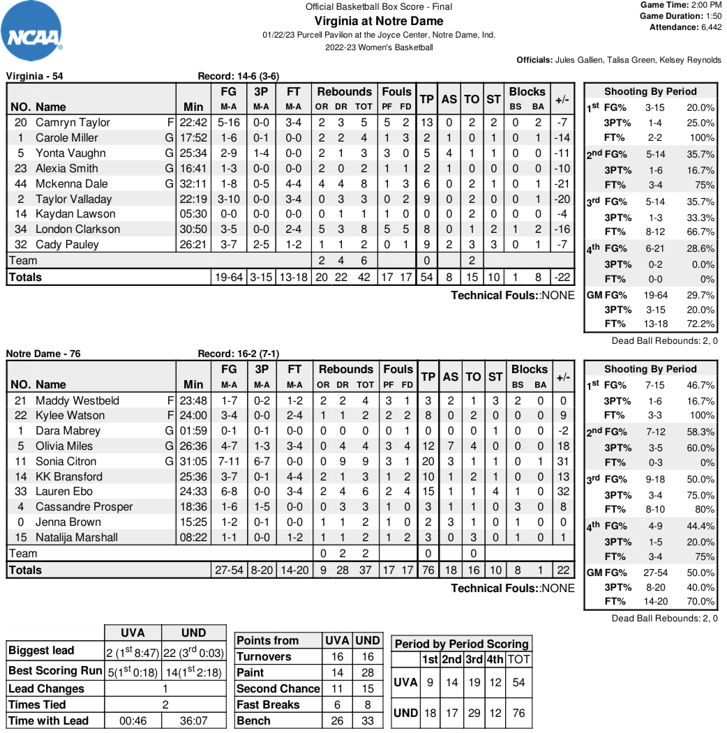 Notre Dame broke the game open early, using a 14-0 run to establish an 18-4 lead. The Cavaliers (14-6, 3-6) missed 10 consecutive field goals attempts during the quarter and turned the ball over eight times.