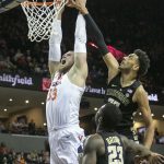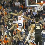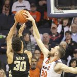- Virginia’s Jay Huff gets a clean block on an inside shot by Wake Forest’s Olivier Sarr. (Photo by John Markon)