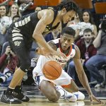 - Virginia’s Mamadi Diakite redirects a shot by Wake Forest’s Jaylen Hoard.