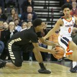 - Virginia’s Kihei Clark pressures Deacons point guard Brandon Childress.