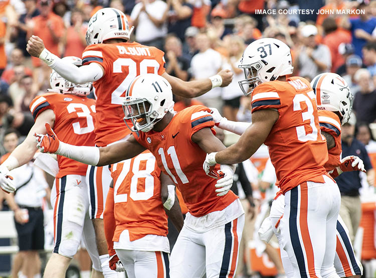 Virginia defenders celebrate around Charles Snowden (11) after a defensive stop vs. Louisville in 2018 (Photo by John Markon).