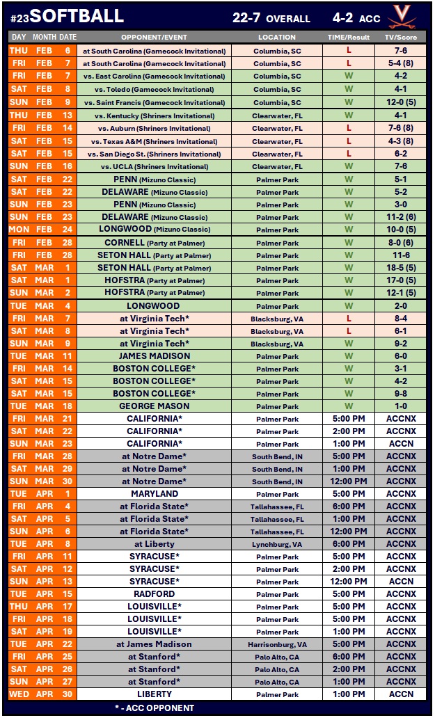 The Cavaliers (22-7) broke the stalemate in the third inning with a Kelly Ayer single to center that scored Jade Hylton from second. Hylton drew a walk to reach and stole second to set up the score on the Ayer hit.